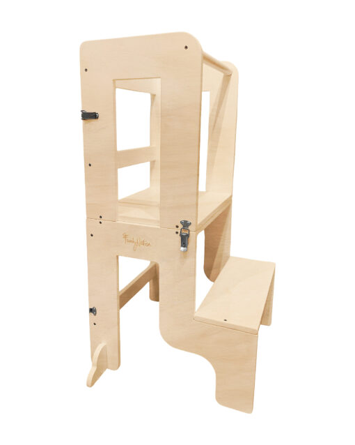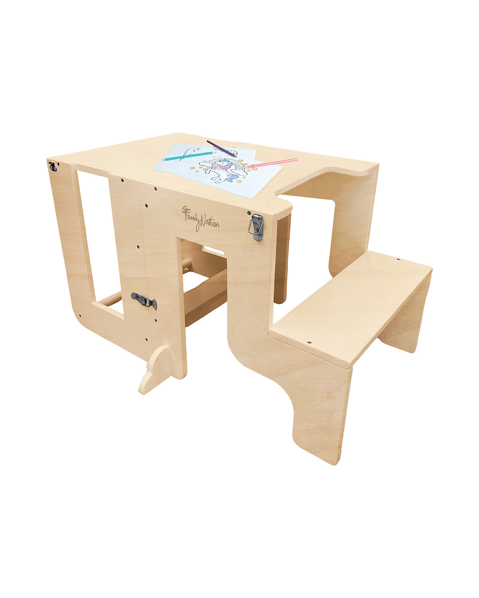 - Con un semplice gesto, la torre si trasforma in un tavolino con sedia, perfetto per disegnare, fare i compiti o leggere un libro.