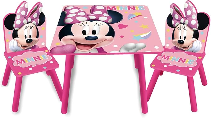 Questo set è composto da un tavolo (50x50x44 cm) e 2 sedie (26,5×26,5×50 cm). Realizzato in legno verniciato e MDF con decalcomania.