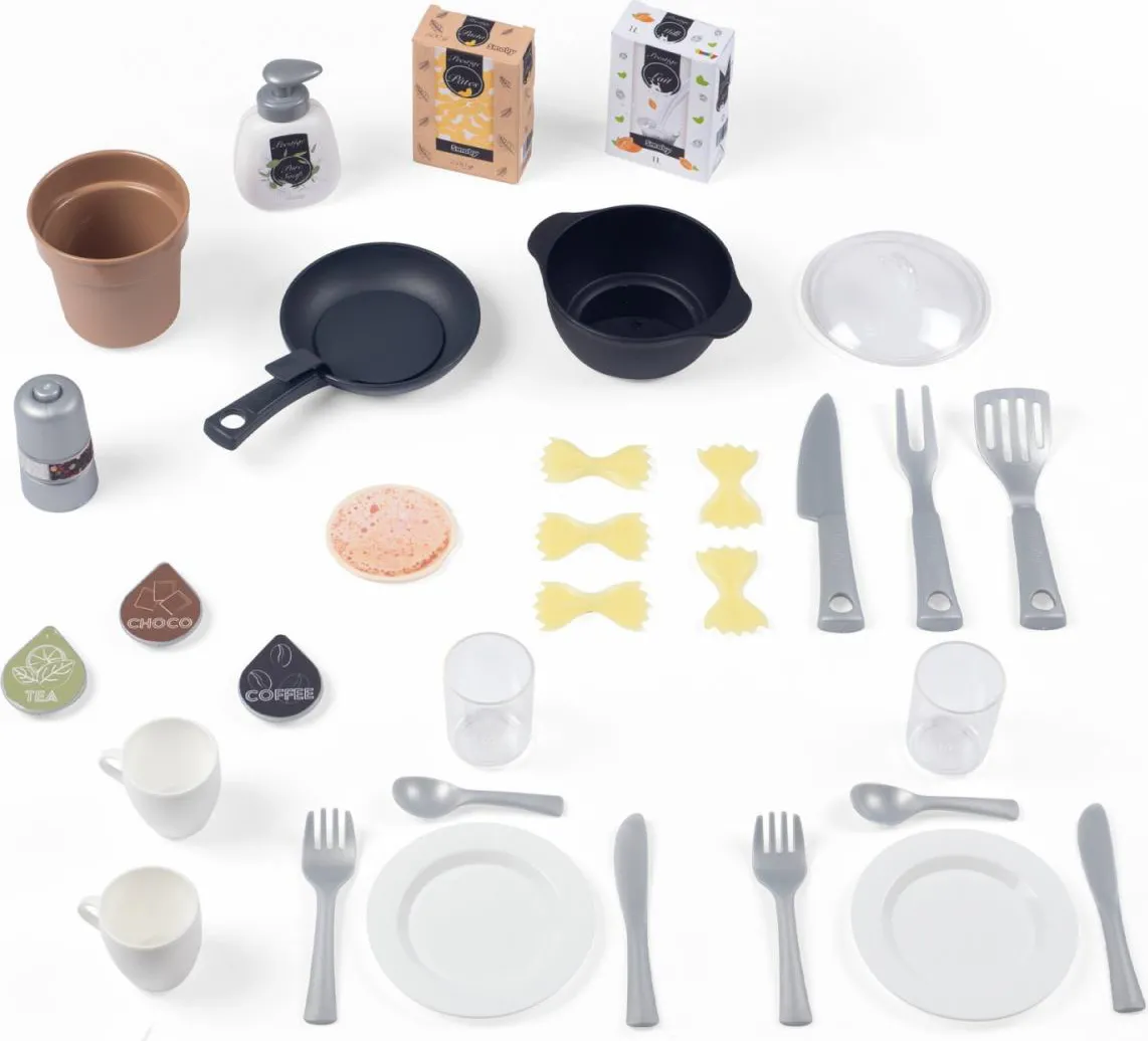 - Include 32 accessori tra cui posate, utensili, stoviglie, pentole, capsule per caffè, pasta termosensibile, macinino per sale e pepe e molto altro per arricchire il gioco.